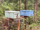 Boxes resembling coolers, pairs set on posts in forest in Central LA