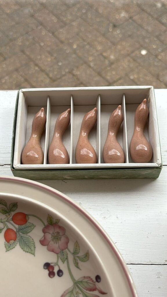Found in a charity shop in Margate, UK. They don’t feel hollow, they’re made of china or pottery, so pretty light but not super sturdy or strong. They have a flat base on the bottom bulb, there are no holes that I could see, and no clues on the box either.