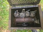 Found in an old shed, metal box rusted, heavy, gots 4 round things inside. Has a dial on the side