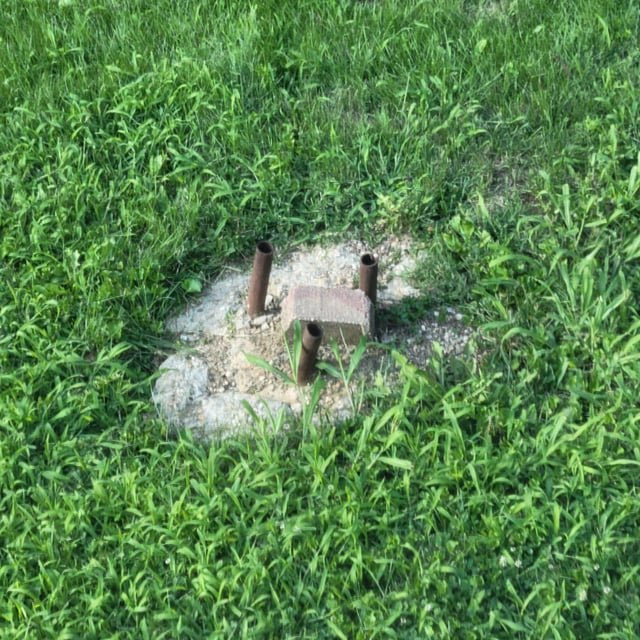 In new backyard. 3 metal poles (about 1.5″ diameter) with concrete block in middle. Entire thing is set in concrete.