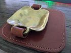 Leather (14x14cm) and metal (8x8cm)…ash tray? Got it as a freebie from a FB sale. We’re assuming it’s not an ash tray because the leather would get damaged when you miss..