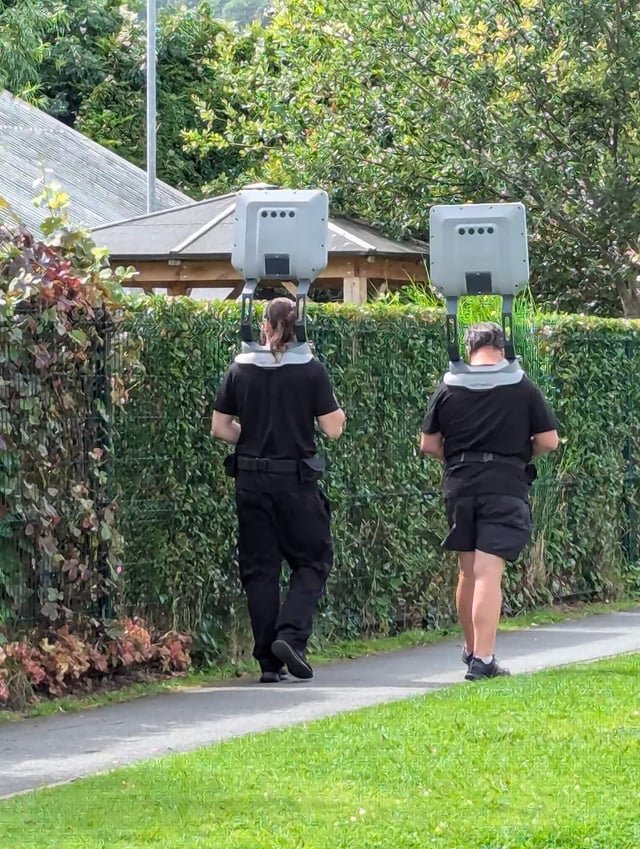 Two men carrying shoulder mounted devices which are grey in colour, have 4 black circles and a black square panel. Each person has the device strapped around their waist. They appear to be some sort of scanning or detection equipment. What are they?